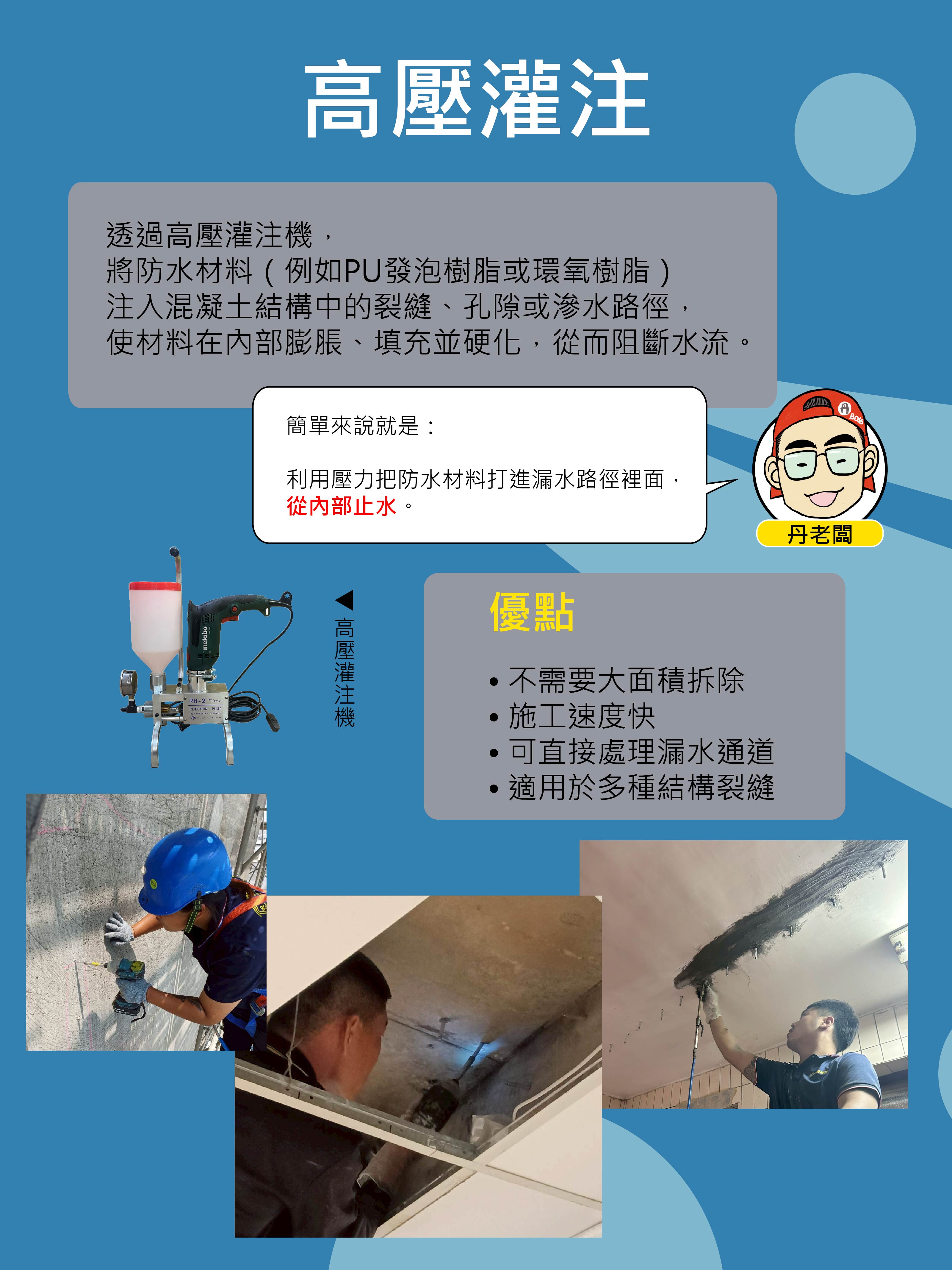 高壓灌注是一種針對「已發生滲漏」的工程解決方案,其價值在於能夠深入結構內部,直接處理水的流動路徑。然而,其效果高度依賴材料選擇、壓力控制與施工判斷,並且必須與其他防水工法配合,才能形成完整且長效的防水系統。