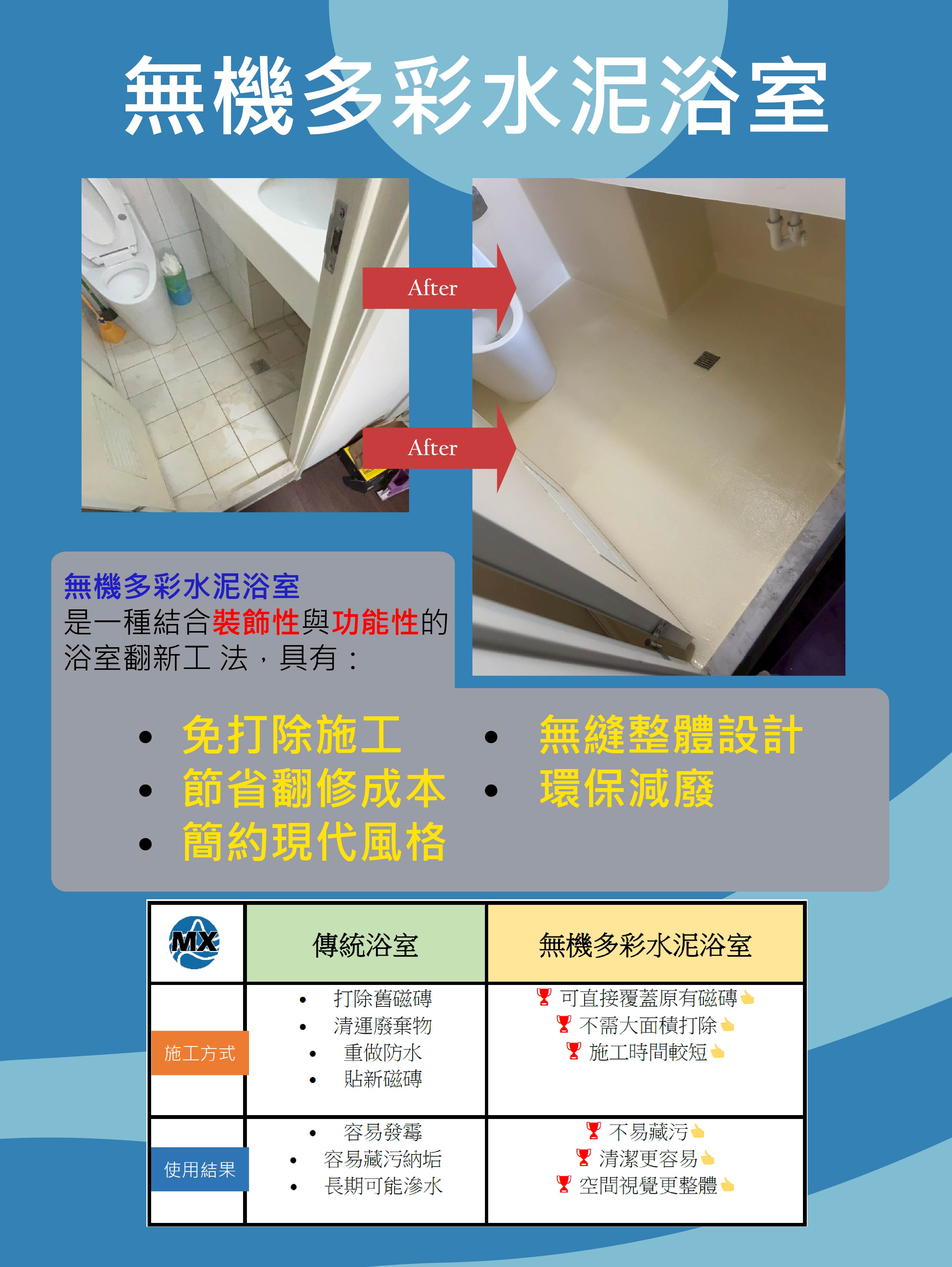 無機多彩水泥浴室是一種近年在室內裝修與防水修繕中逐漸流行的浴室施工方式。它利用無機水泥基材與礦物顏料形成裝飾與防護層,可直接覆蓋在原有磁磚或水泥表面,打造無縫整體浴室空間,具有施工快速、節省成本與環保等優點